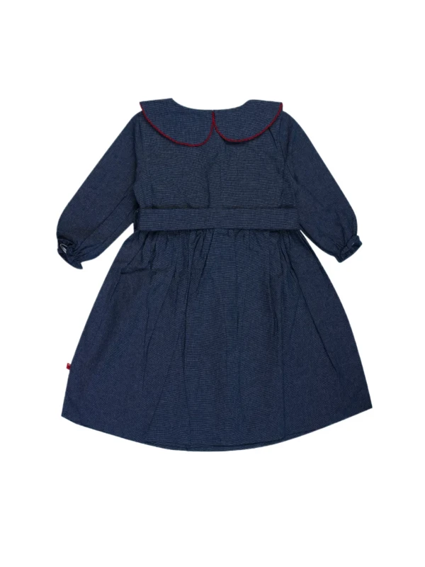 Crafted from soft, high-quality denim, this stylish knee-length dress features a cute embroidered design, contrast scallop collar, and a tie-up waist for a perfect fit. Ideal for parties, playdates, or casual outings. Comfortable, breathable, and easy to wear!