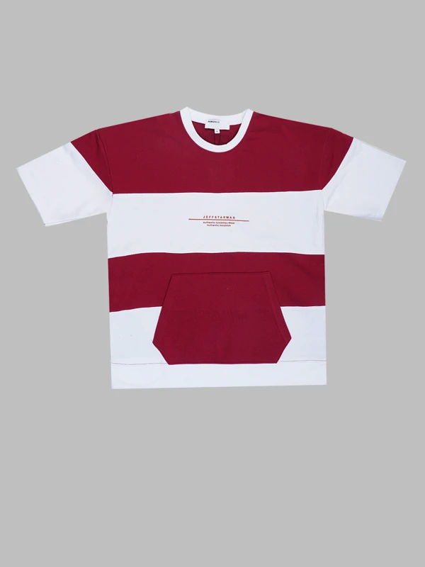 Stand out in this stylish maroon and white block striped t-shirt featuring a chest print and handy front pouch pocket. Soft cotton fabric ensures comfort and a bold streetwear vibe.
