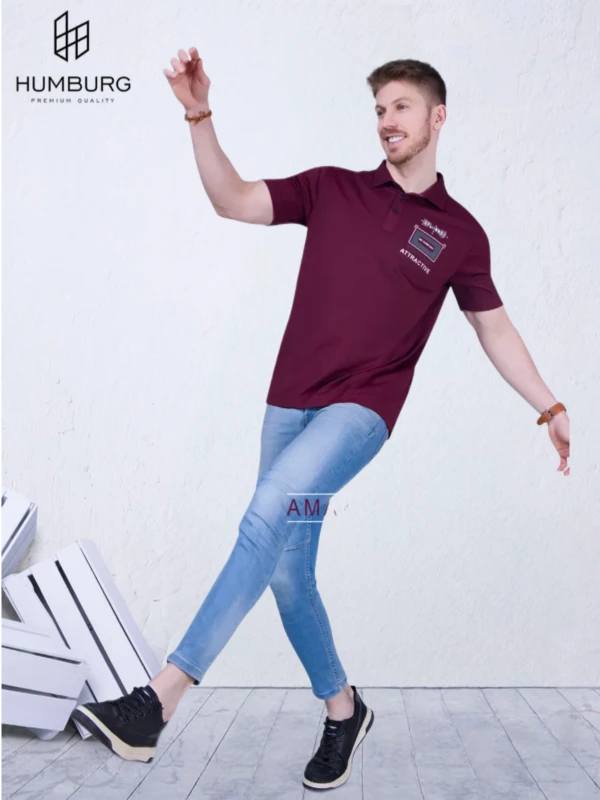 Stylish maroon polo t-shirt with modern chest print and a comfort-first fit. Made from soft cotton fabric, perfect for smart casual looks and daily wear