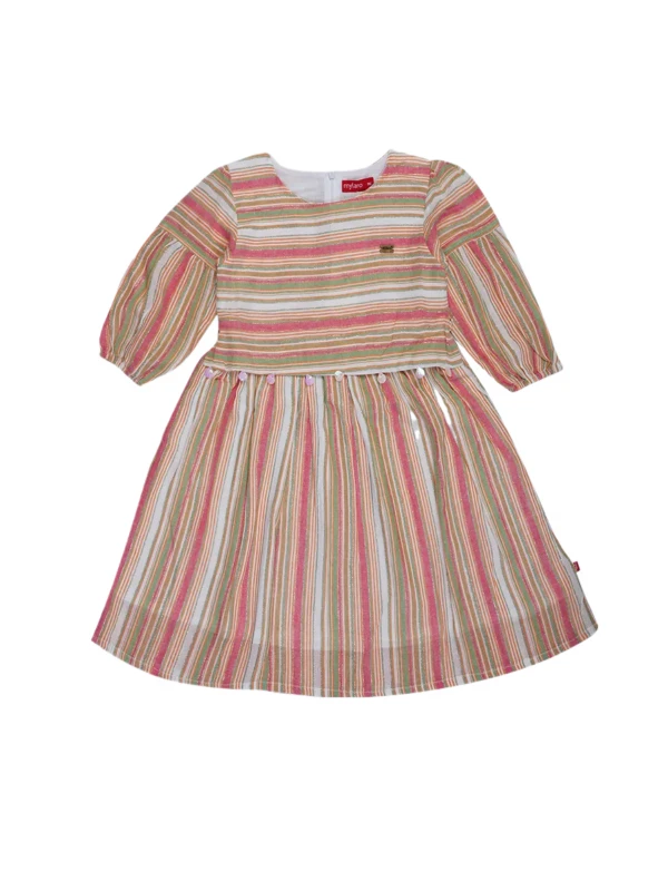 This cheerful striped dress features soft pastel tones, puff sleeves, and a comfy fit-and-flare silhouette. Made from breathable cotton blend – perfect for casual outings, playdates, or summer days!