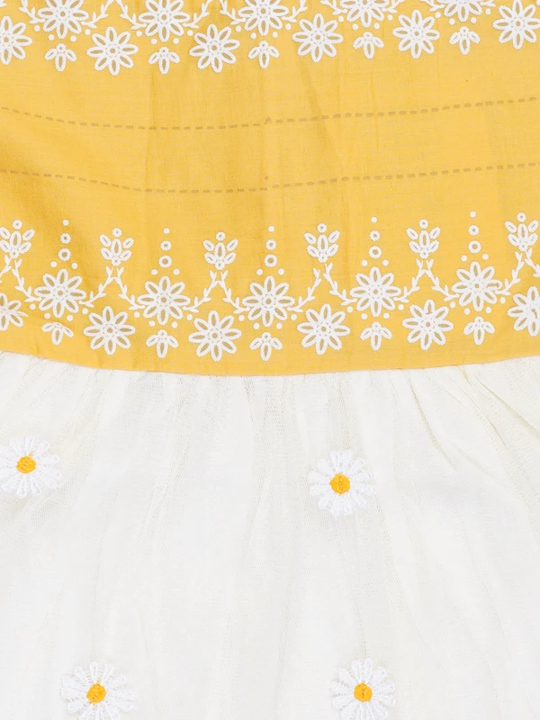 This charming dress features a mustard yellow embroidered bodice and a white net flare with daisy detailing. Crafted from soft, breathable fabric – perfect for birthdays, photo shoots, or festive occasions!