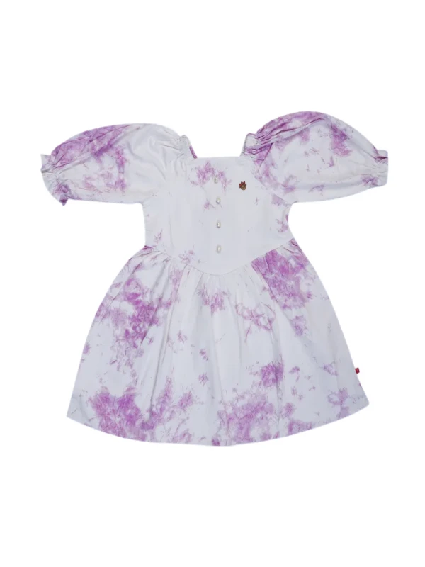 This lovely dress features a soft pink tie-dye pattern, elegant puff sleeves, and front pearl-style buttons. Made from breathable cotton fabric – perfect for birthdays, playdates, or summer outings in style!
