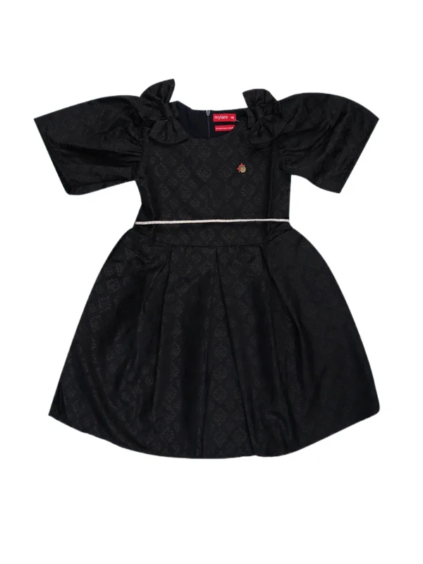 This beautiful black dress features a subtle jacquard pattern, dramatic puff sleeves, and a delicate waist belt. Crafted from rich, breathable fabric – perfect for birthdays, weddings, and festive celebrations!