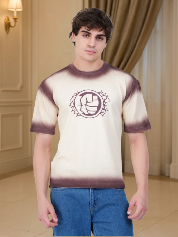 Make a statement with this cream T-shirt featuring a striking maroon ombre effect and powerful graphic print. Crafted for comfort and designed for modern streetwear appeal.