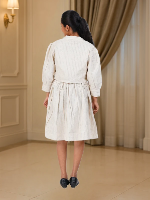 This peach-colored dress with subtle polka dots features charming ruffle detailing, puff sleeves, and decorative buttons — a playful pick for casual and semi-formal outings.