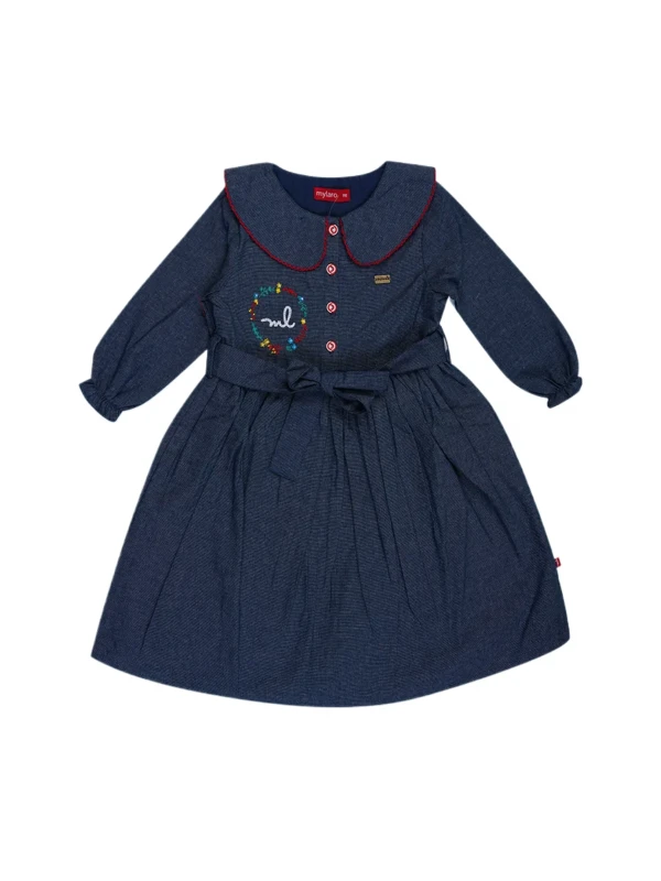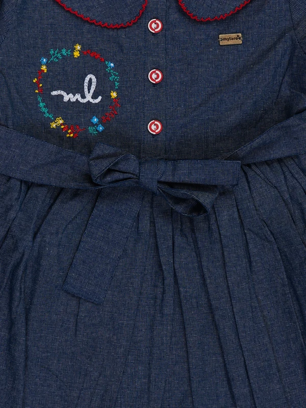 Crafted from soft, high-quality denim, this stylish knee-length dress features a cute embroidered design, contrast scallop collar, and a tie-up waist for a perfect fit. Ideal for parties, playdates, or casual outings. Comfortable, breathable, and easy to wear!