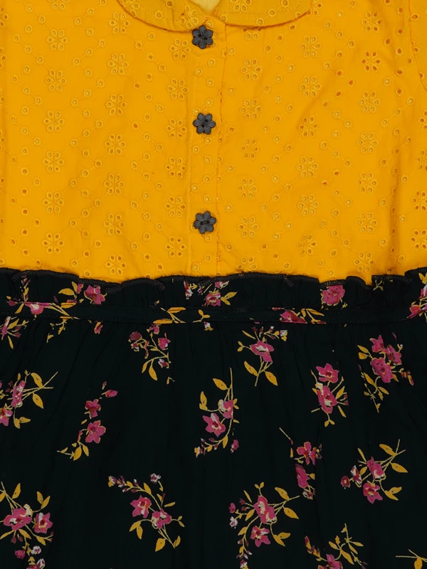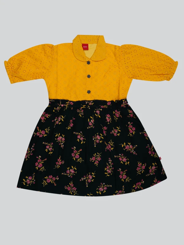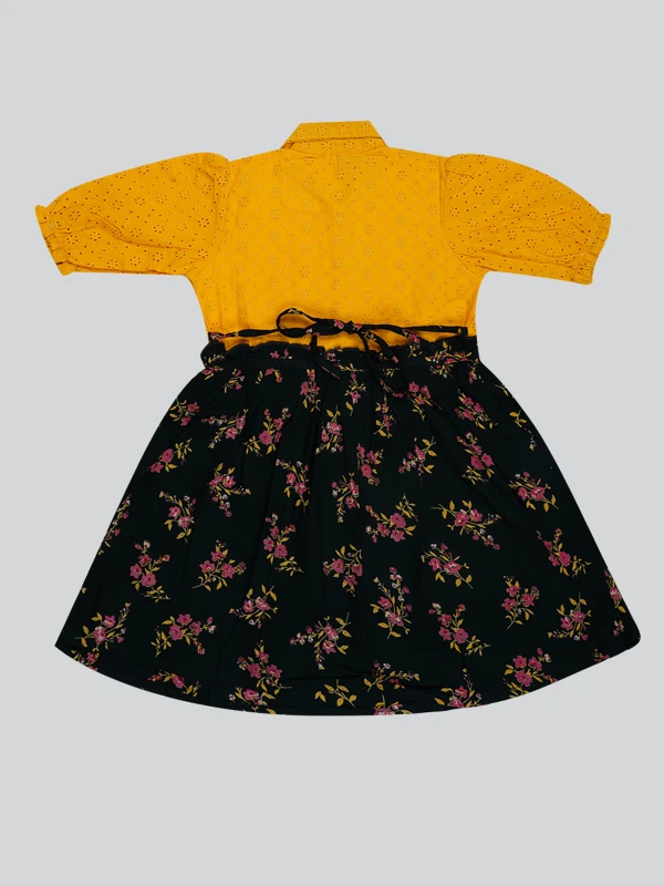 Brighten up her day with this adorable yellow puff-sleeve dress featuring floral buttons and a stylish black skirt with pink flower prints. Perfect for parties, outings, and special occasions. Soft fabric, elegant look, and all-day comfort.