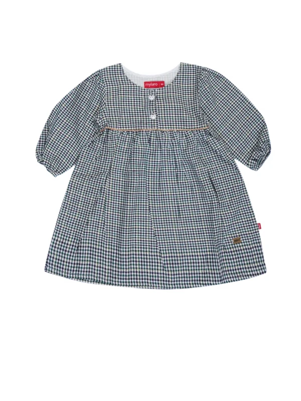 Adorable and comfy, this green gingham dress features cute buttons, a gathered waist, and full sleeves. Made from soft, breathable cotton – perfect for daily wear, playtime, or special moments!