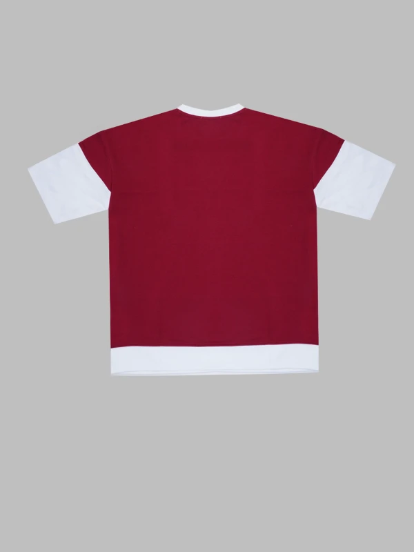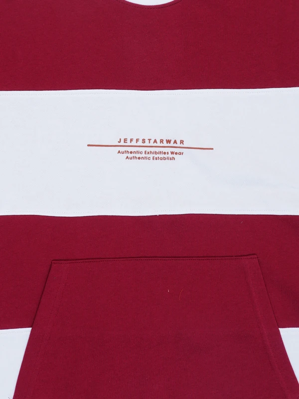 Stand out in this stylish maroon and white block striped t-shirt featuring a chest print and handy front pouch pocket. Soft cotton fabric ensures comfort and a bold streetwear vibe.