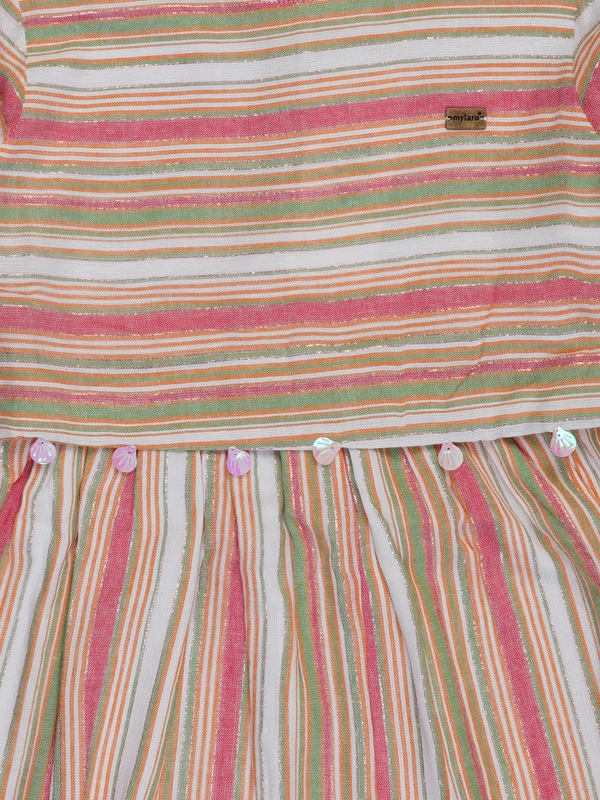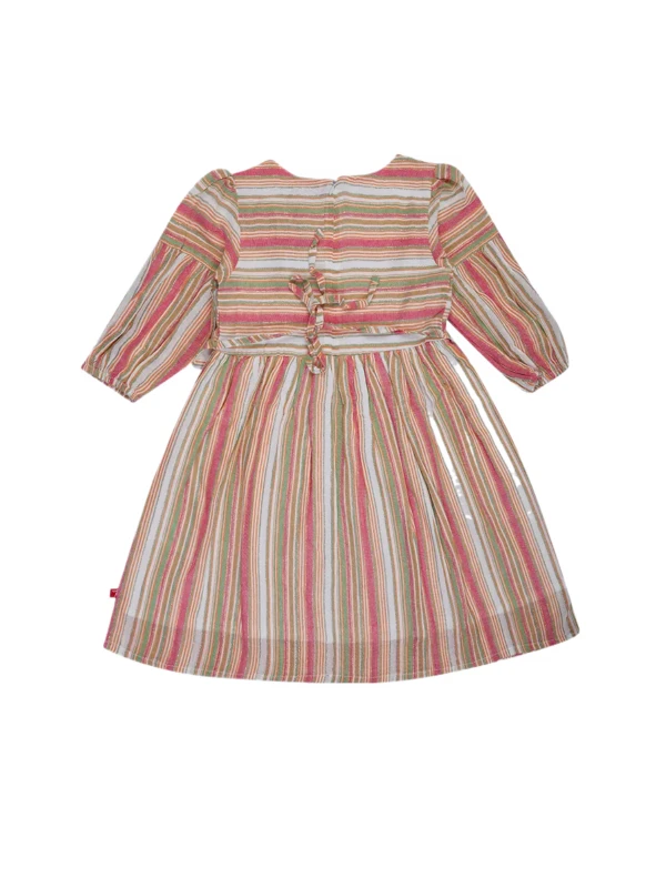 This cheerful striped dress features soft pastel tones, puff sleeves, and a comfy fit-and-flare silhouette. Made from breathable cotton blend – perfect for casual outings, playdates, or summer days!
