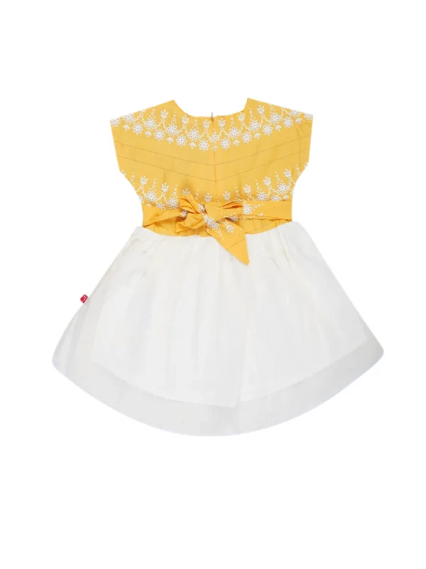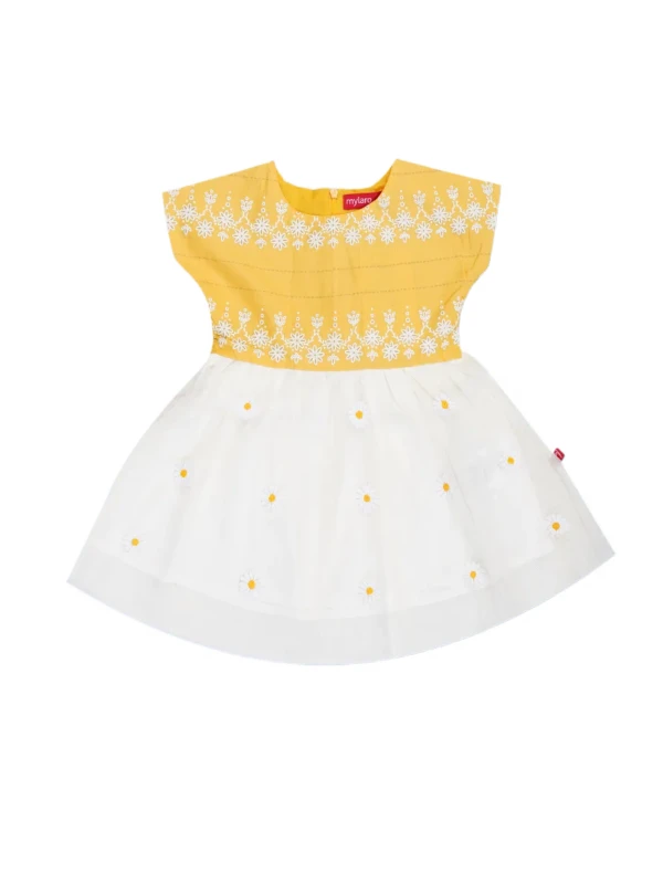 This charming dress features a mustard yellow embroidered bodice and a white net flare with daisy detailing. Crafted from soft, breathable fabric – perfect for birthdays, photo shoots, or festive occasions!
