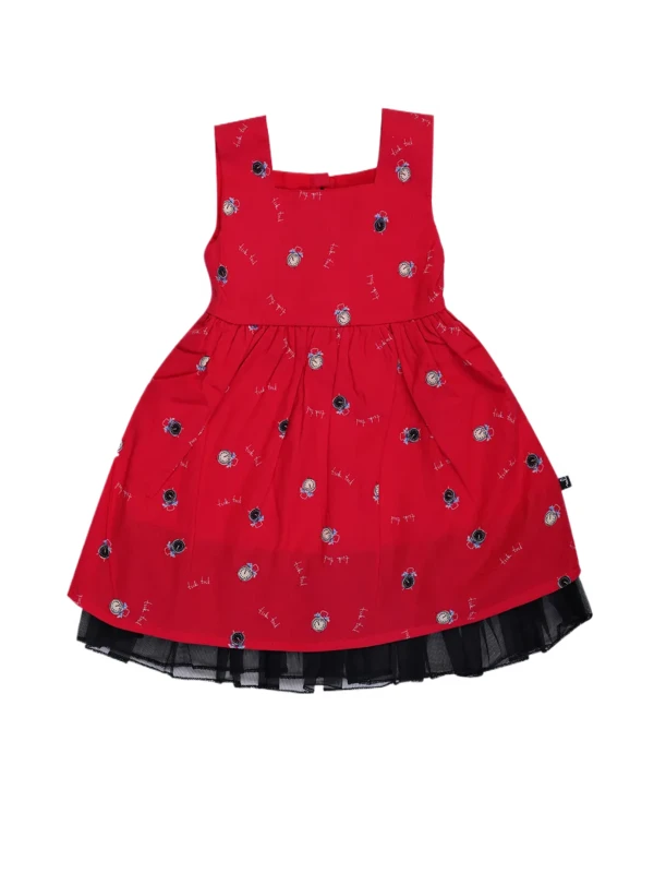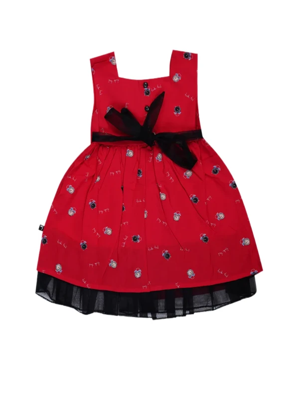 This adorable red frock features playful prints, a square neckline, and layered black net frills at the hem. Made from soft, breathable fabric – perfect for birthdays, casual outings, or everyday cuteness!
