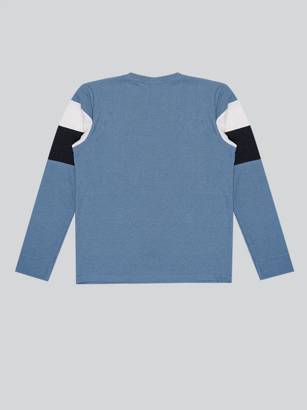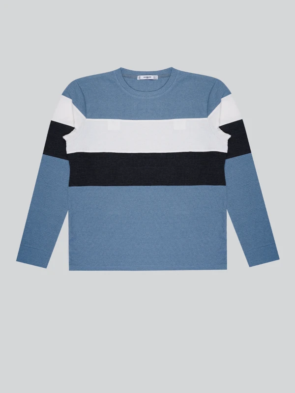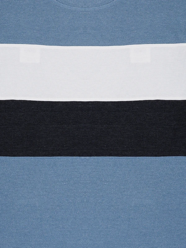 Upgrade your casual look with this slate blue full sleeve tee featuring bold black and white colorblock stripes. Crafted in soft, breathable fabric—perfect for everyday wear or weekend outings.