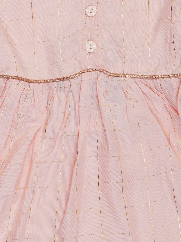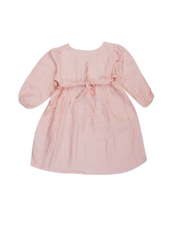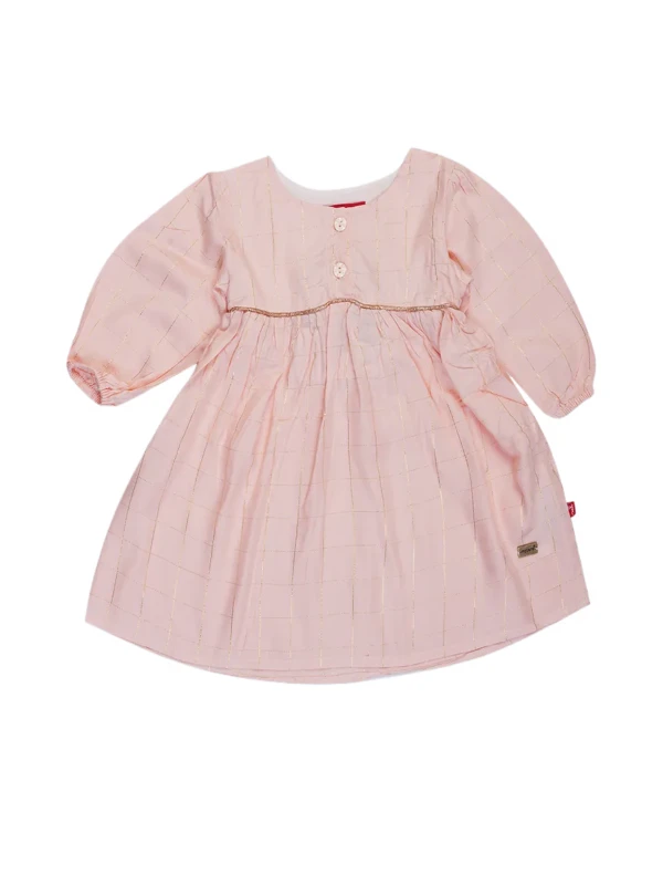 This charming peach dress features subtle golden checks, long sleeves, and a cute buttoned front. Crafted from soft, breathable cotton for all-day comfort and timeless baby girl style.