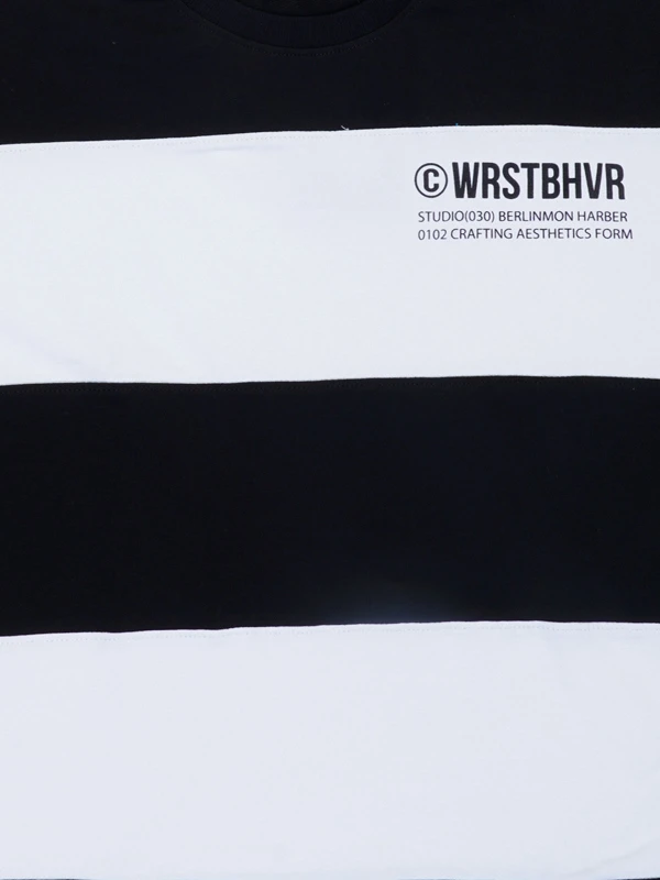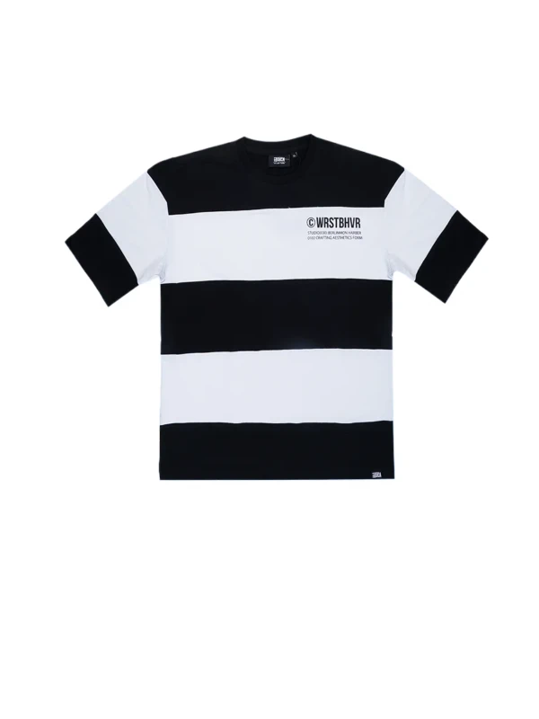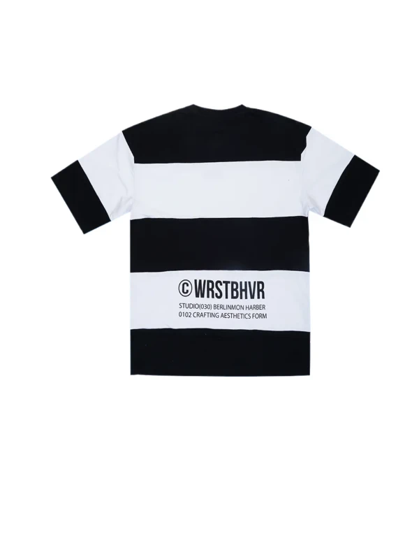 Make a bold statement with this black and white striped t-shirt featuring WRSTBHVR chest print. Designed in an oversized fit with soft cotton fabric for comfort and effortless style.